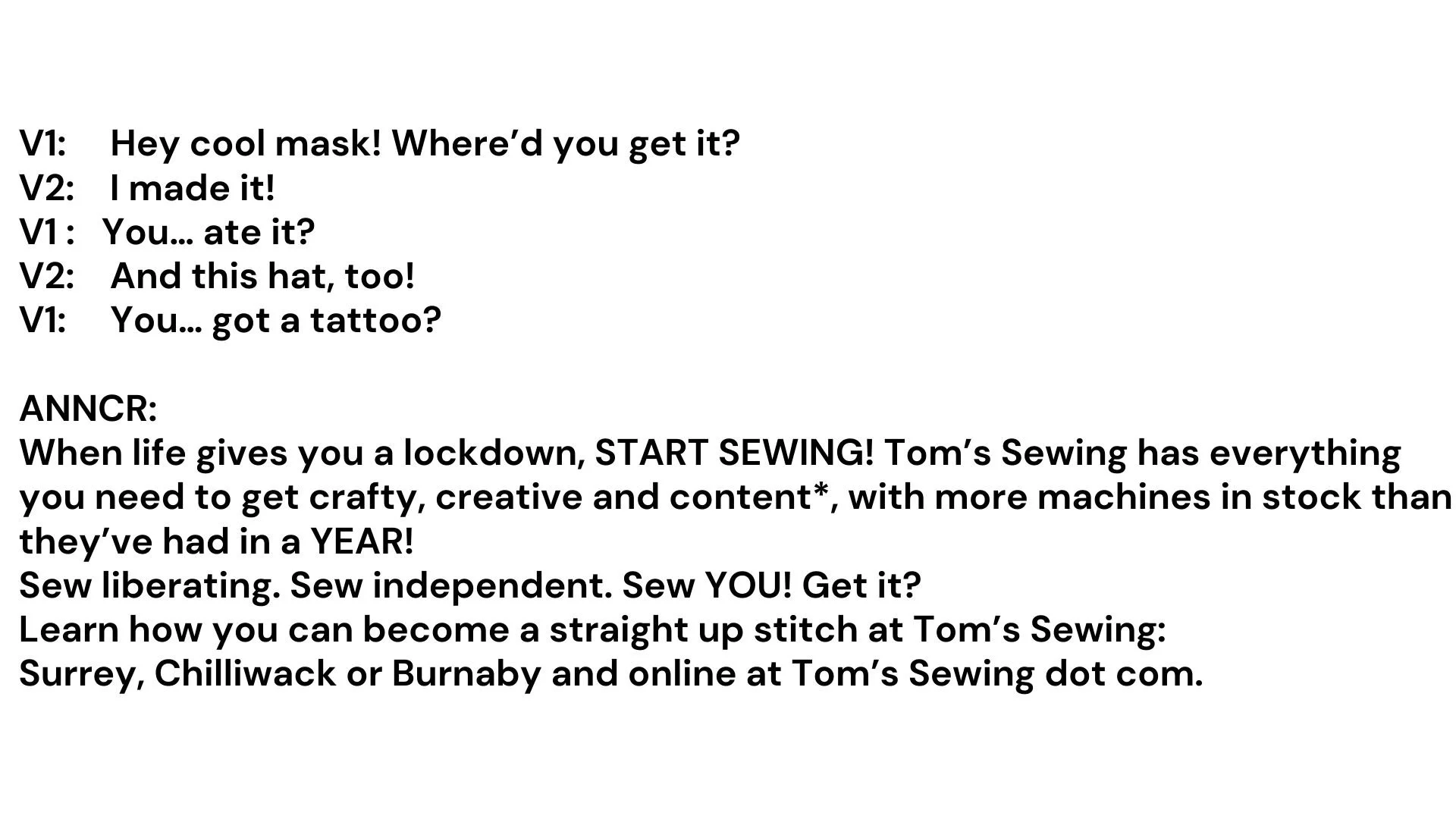 A very popular ad, I created a presentation of the creation process for Tom’s Sewing in Surrey BC.